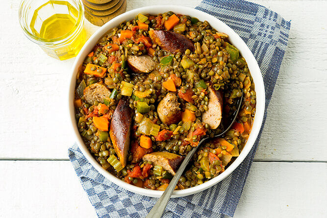 Breng de linzen aan de kook op middelhoog vuur in 1 ½ liter water. Je laat deze koken terwijl je verdergaat met de rest van het recept. Strooi zo’n 1/2 tl zout in het water bij de linzen. Eens het water kookt, zet je het vuur zachter en laat gedurende 20 min sudderen of tot de linzen helemaal zacht zijn. Laat de linzen uitlekken. Proef en voeg eventueel nog wat extra zout toe. Overkook de linzen niet.
